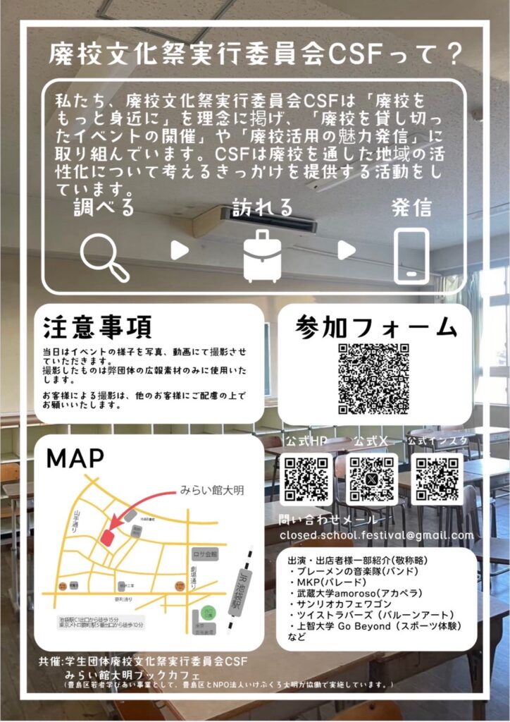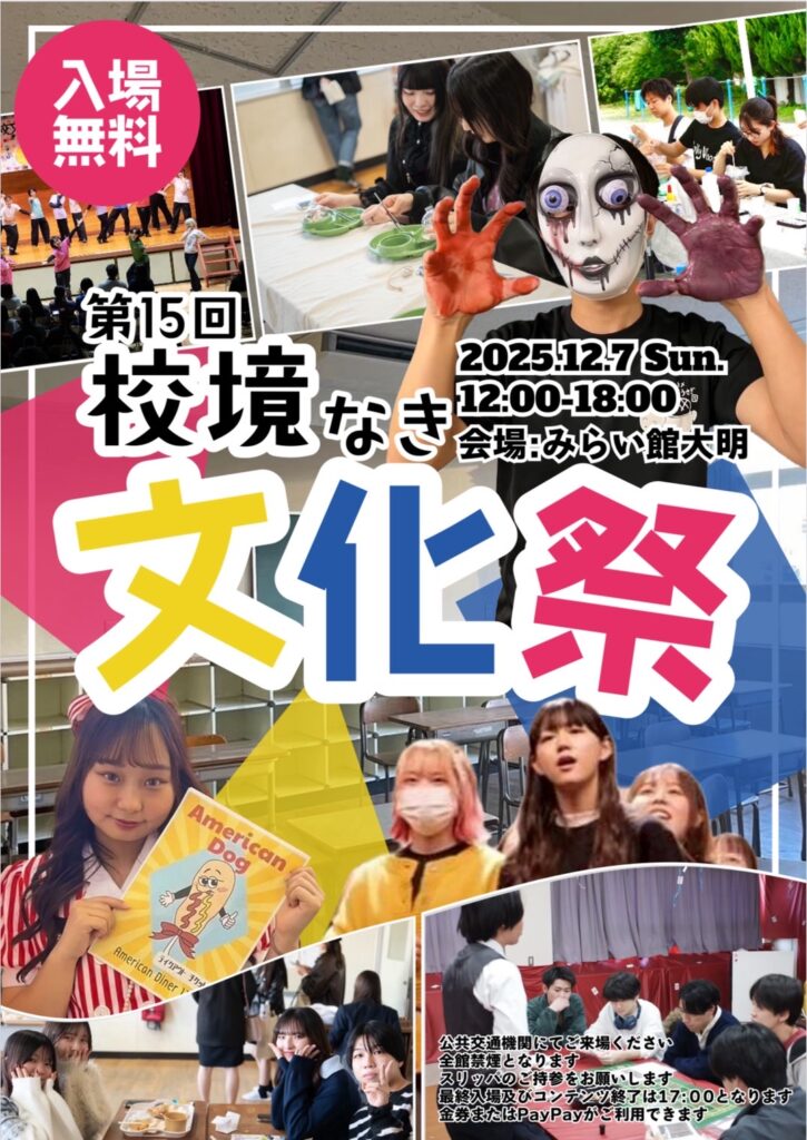 【予告】第15回校境なき文化祭 2025.10.102025.11.05 みらい館大明で、イベントを行います! 日程: 2025/12/07(日) 12:00~18:00 場所: 東京都豊島区池袋3丁目30-8 みらい館大明 入場料: 無料 入場をスムーズにするため、事前の来場者登録をお願いします! >> 来場者登録はコチラから <<